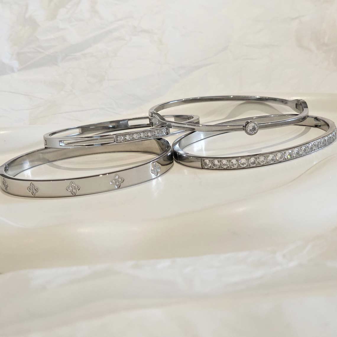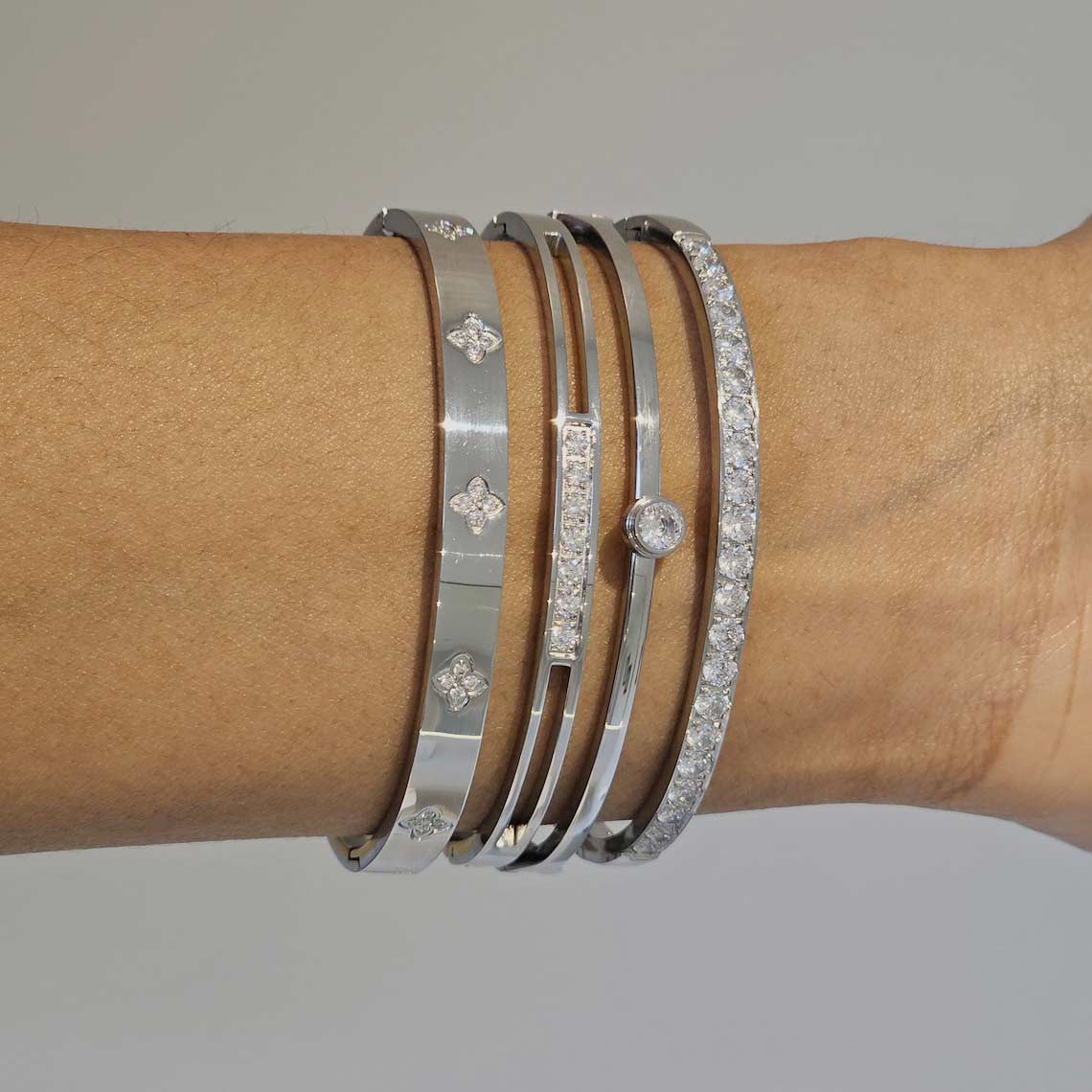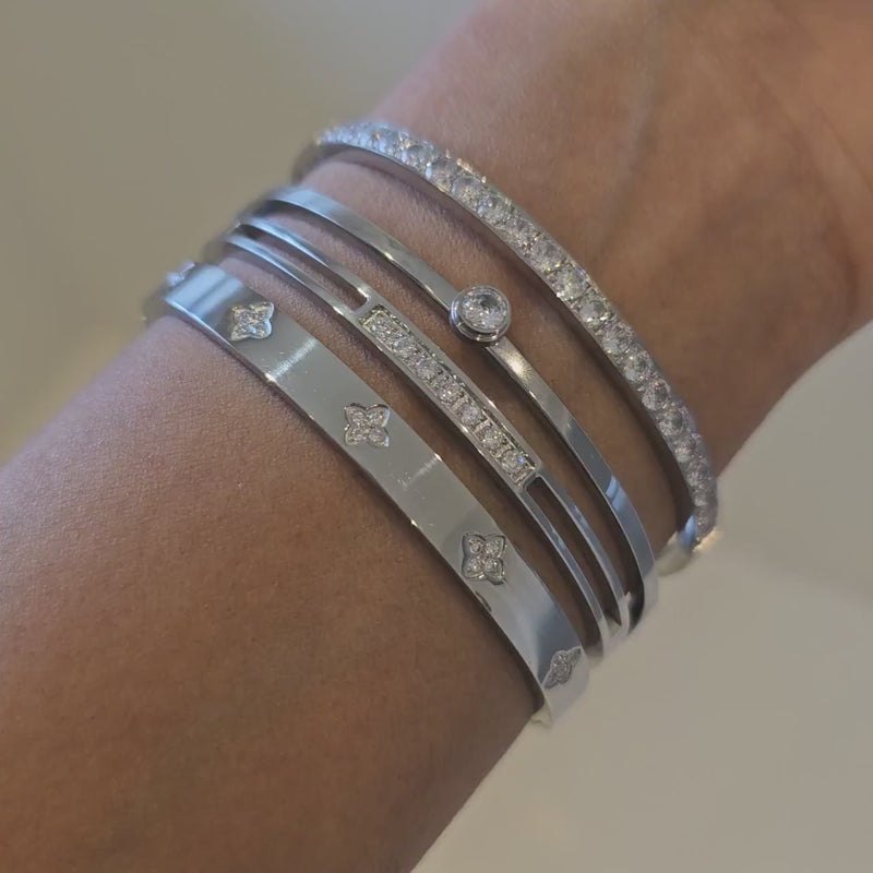 Our Diamond Clover Bangle is the perfect stacking bangle. It features a clover design with CZ crystals for a minimalist look. You can wear this minimalist bangle alone or stacked.
