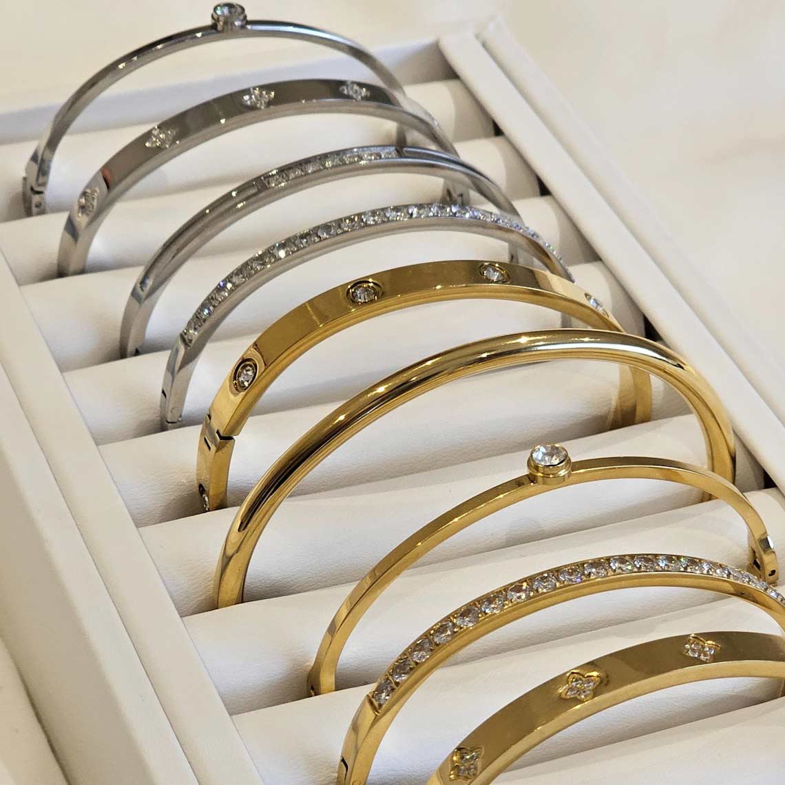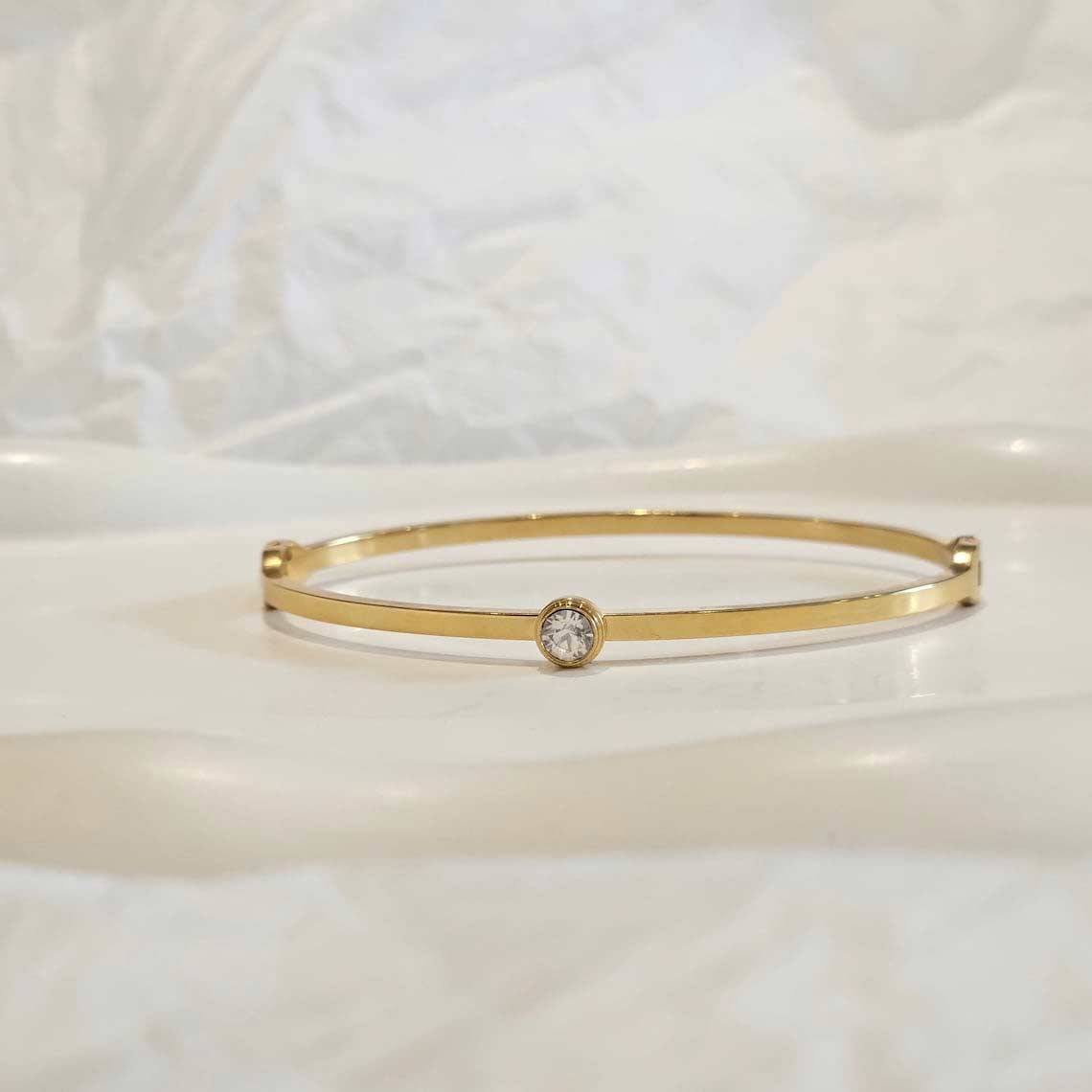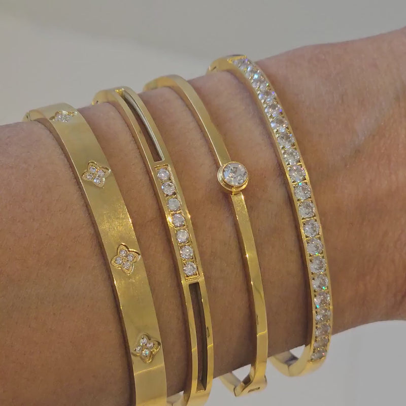 Our Solitaire Diamond Bangle is the perfect stacking bangle. It features a solitaire CZ crystal for a minimalist look. You can wear this minimalist bangle alone or stacked.