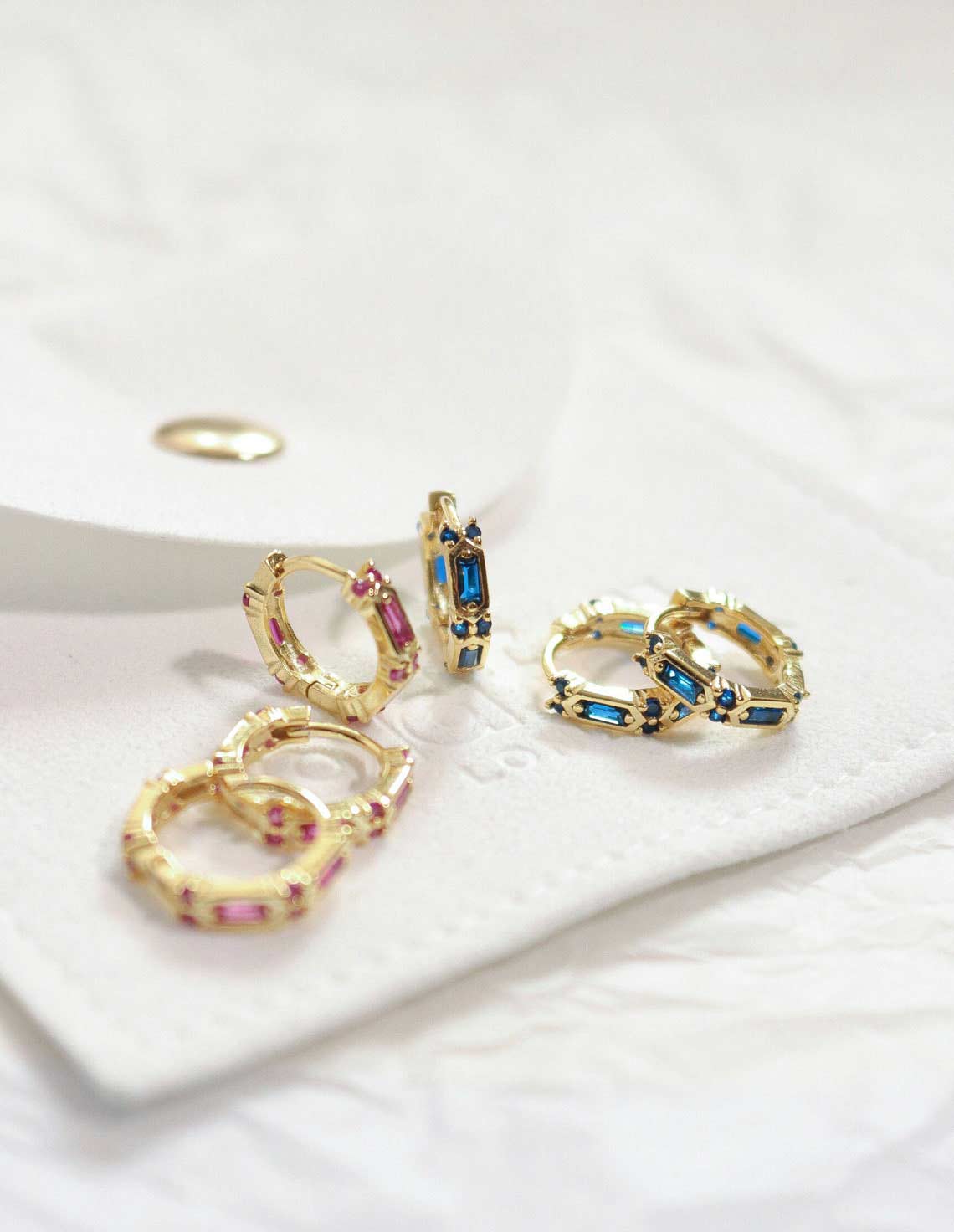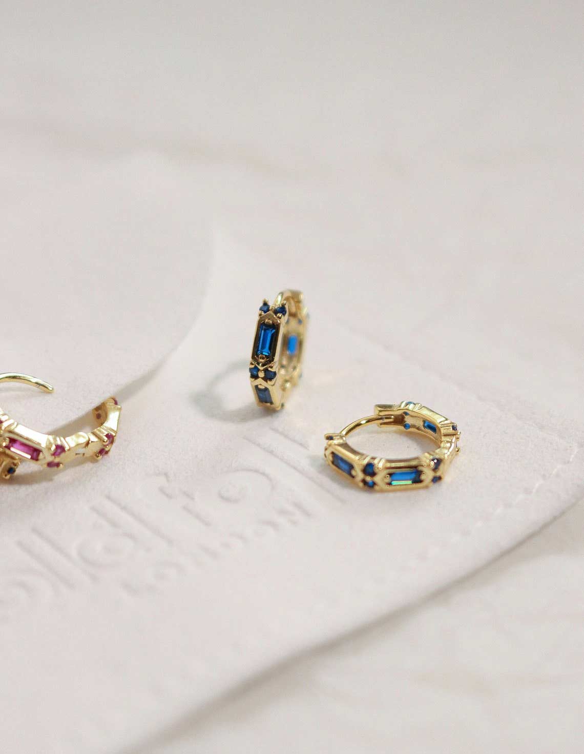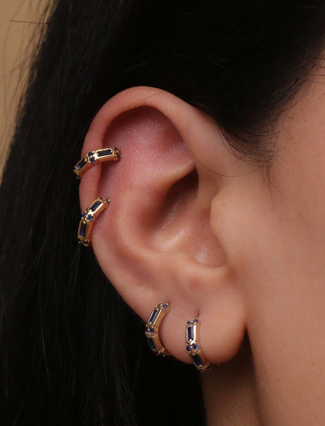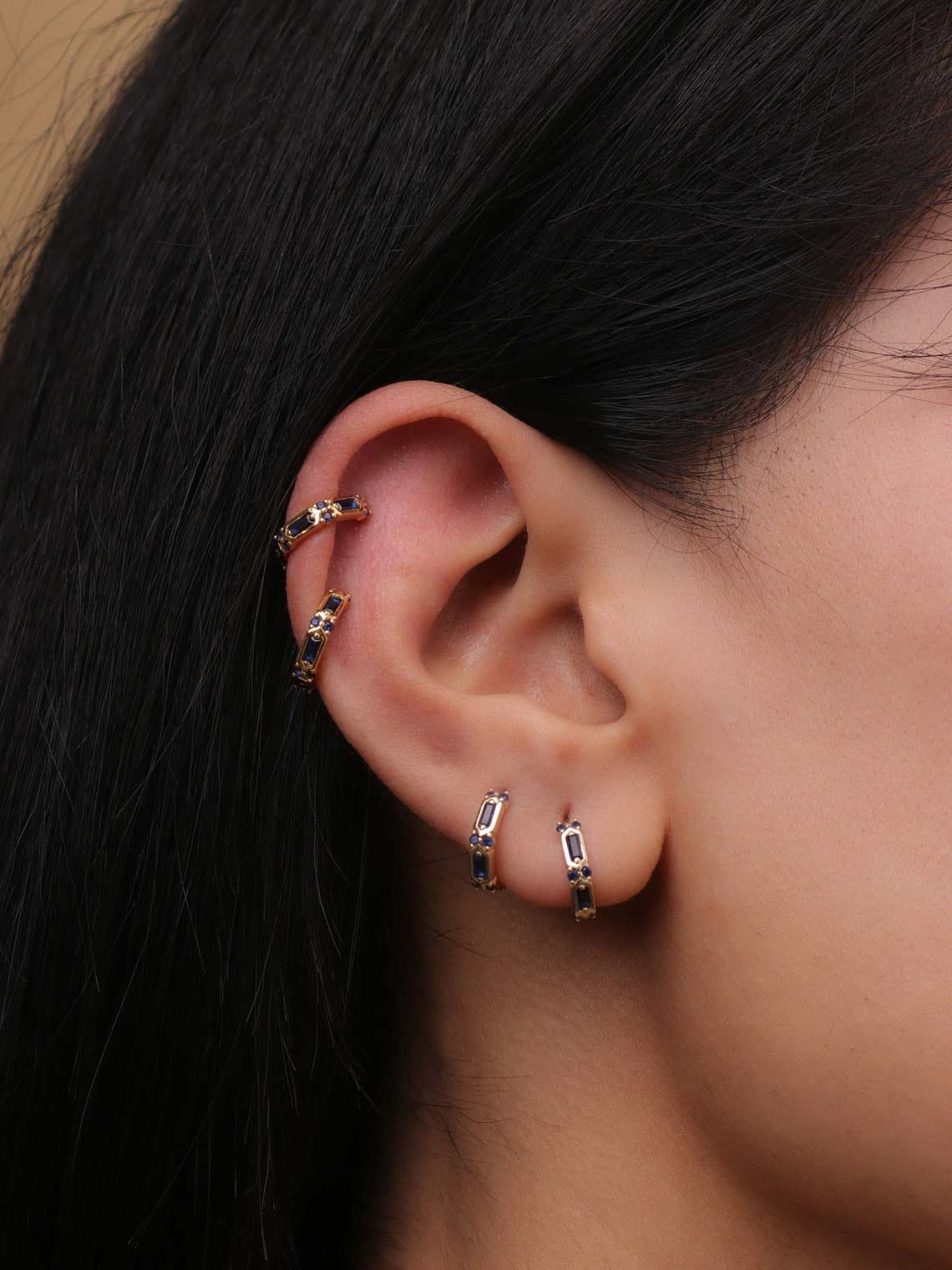 Intricately crafted and composed of 18K gold plated sterling silver, this pair features baguette and cabochon Sapphire gemstones. These hoops have an inner diameter of 9mm and can be worn comfortably on lobe and cartilage piercings.