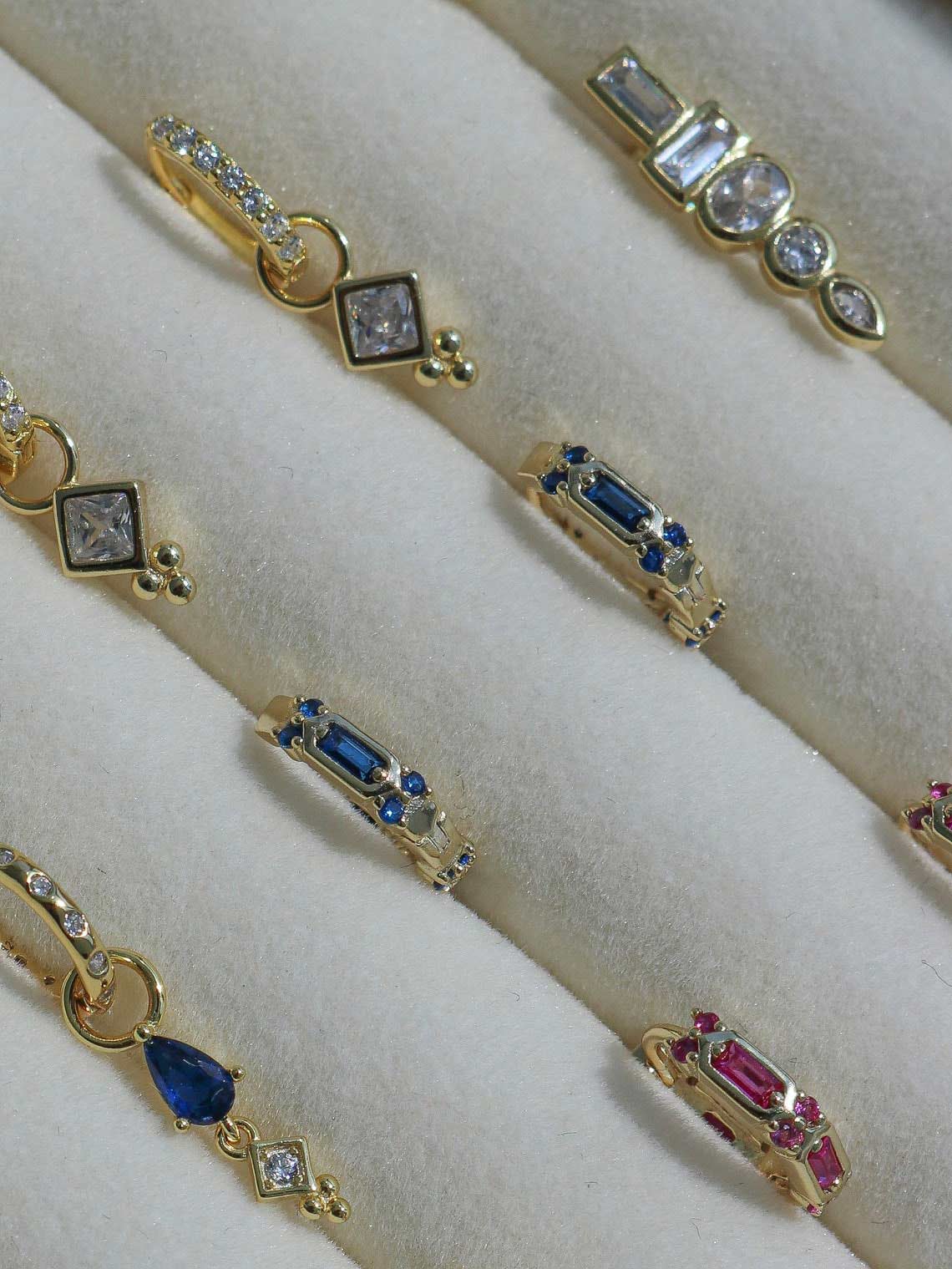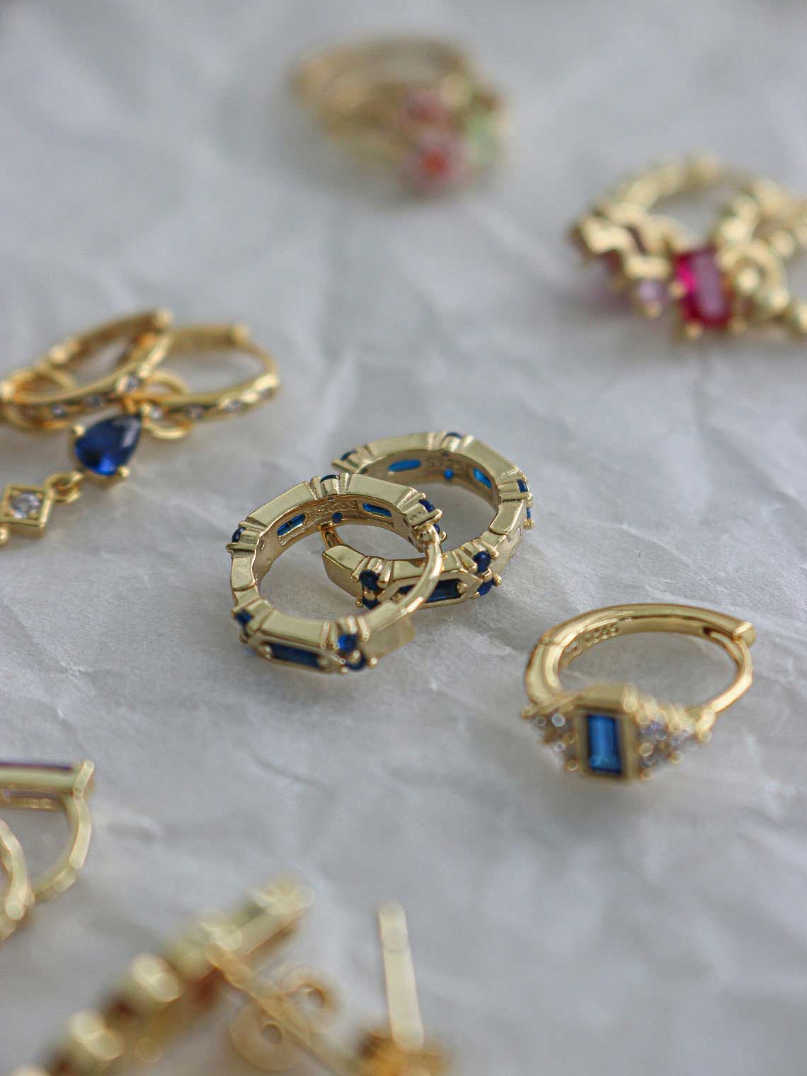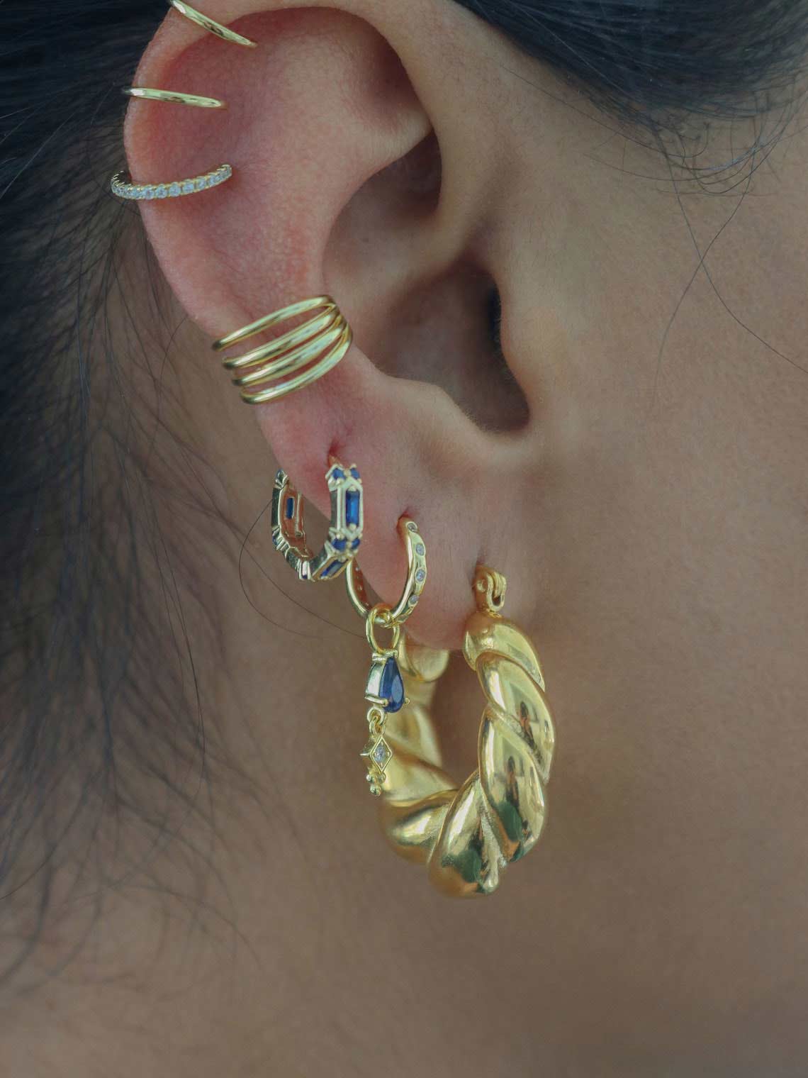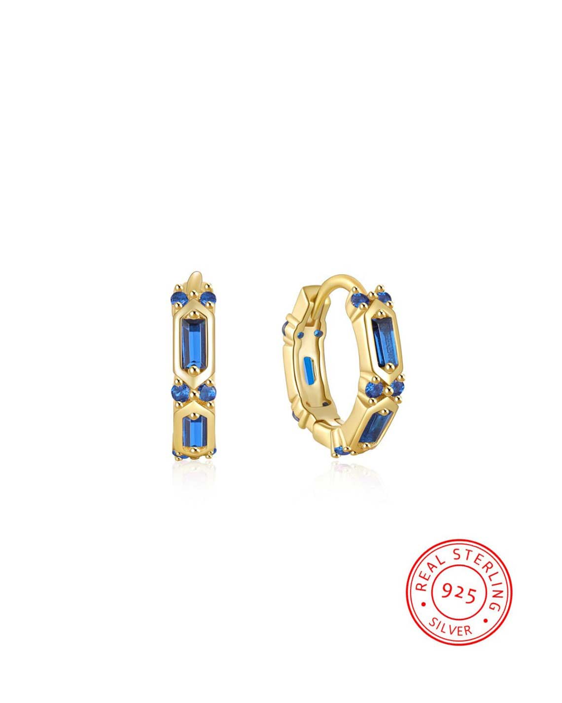 Intricately crafted and composed of 18K gold plated sterling silver, this pair features baguette and cabochon Sapphire gemstones. These hoops have an inner diameter of 9mm and can be worn comfortably on lobe and cartilage piercings.