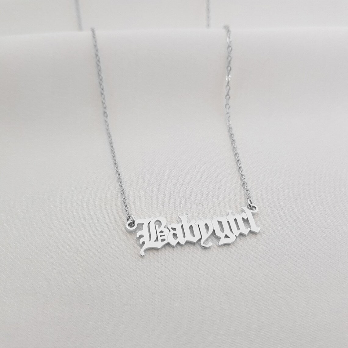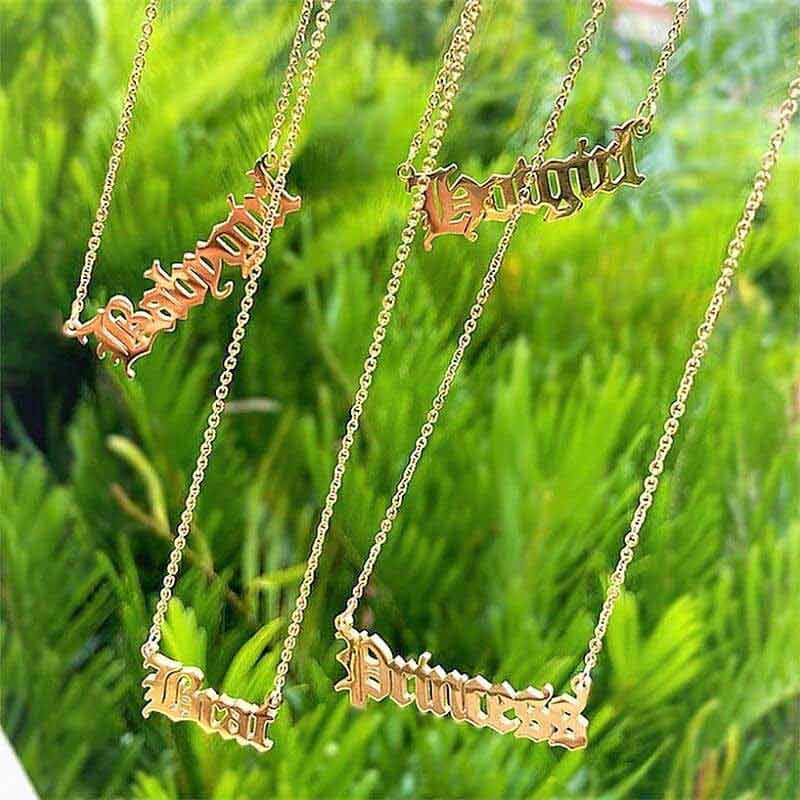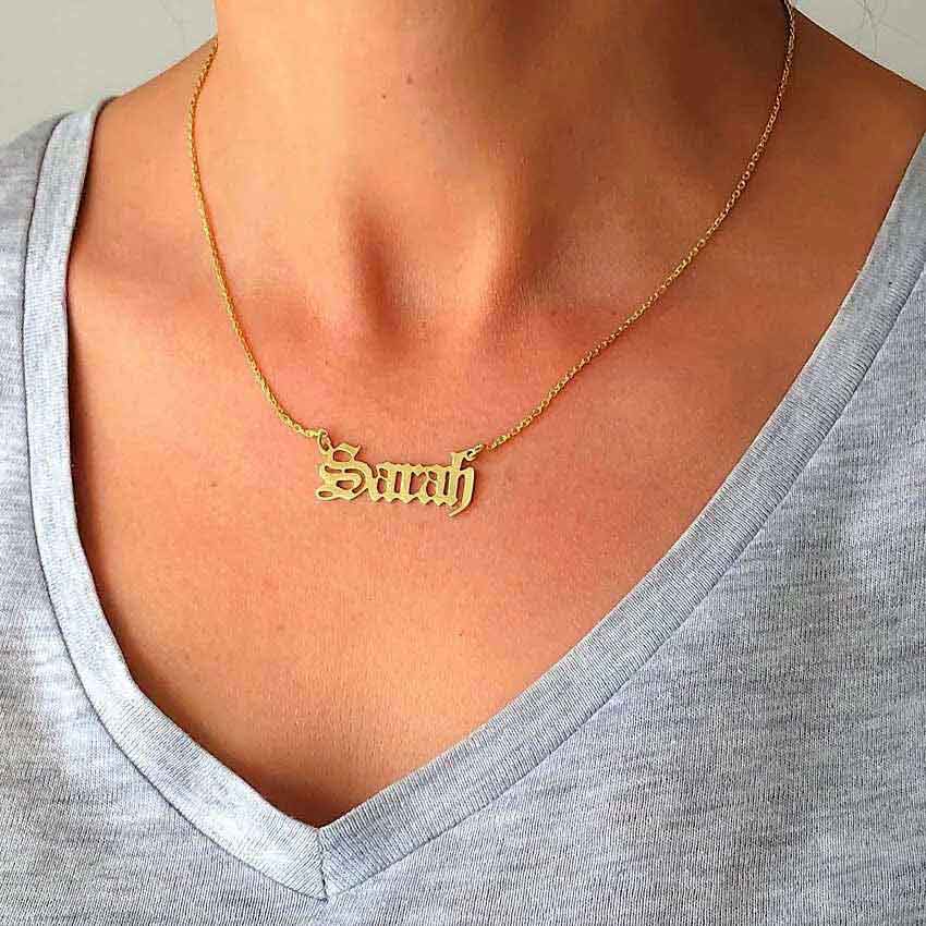 Edginess and style merge in this Old English Name Necklace. This unique bold name necklace for women is an on trend piece, extremely talented at catching the light.