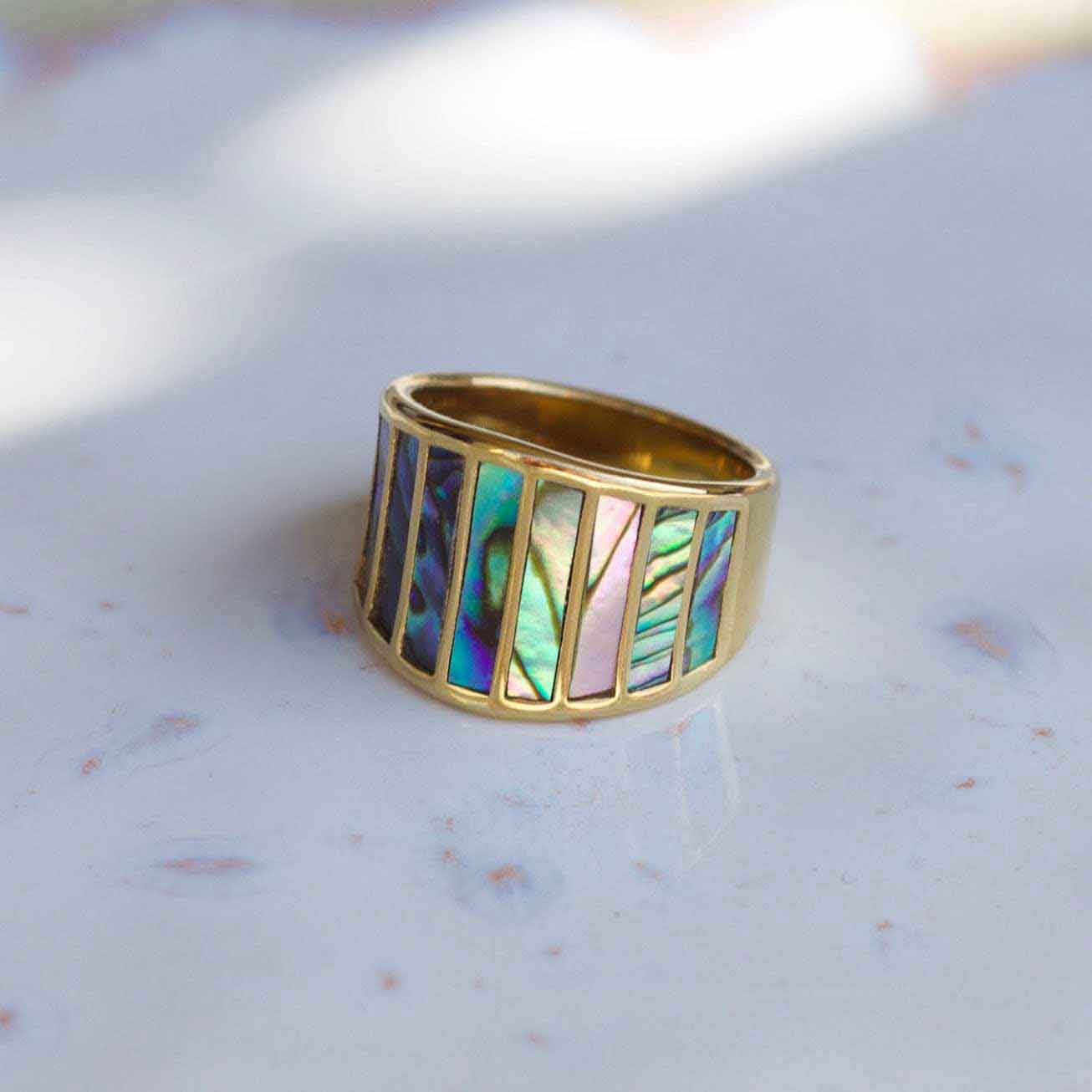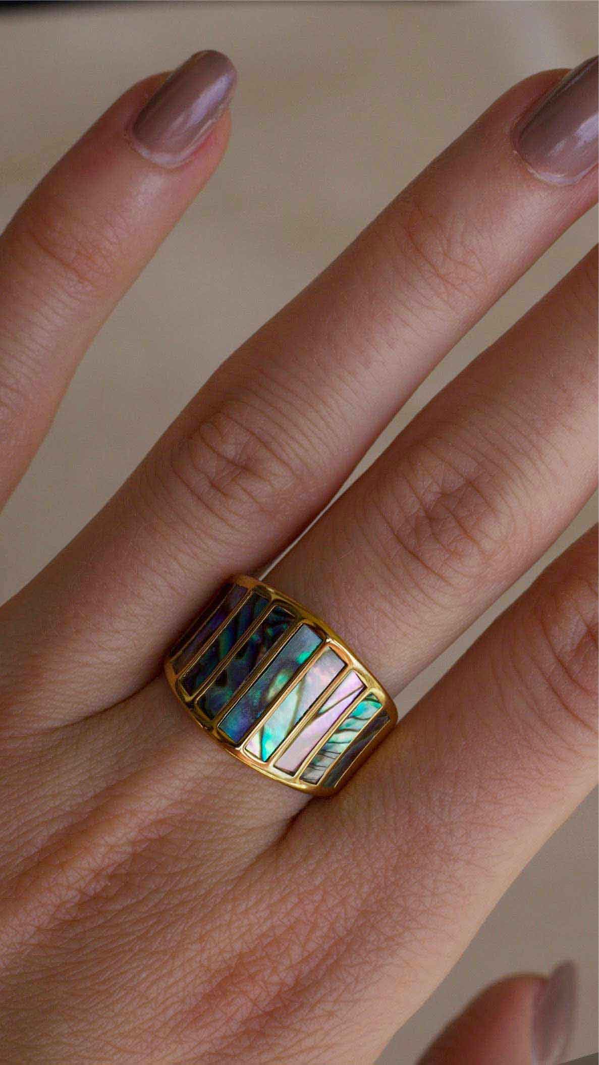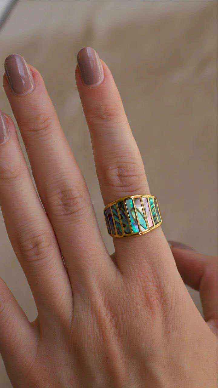 Trendy, bold geometric ring is available in different sizes. Perfect to stack with our other delicate pieces. Made of 18k gold plated stainless steel and natural Abalone shell threader cut stones - made to last.