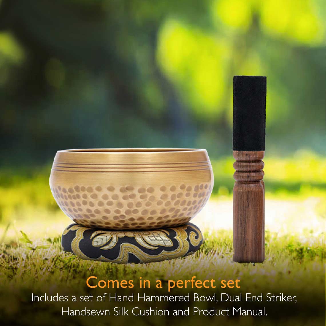 - Ergonomic Design: The 3 inch singing bowl comes with a wooden striker and hand-sewn cushion which flawlessly fits in your hand. The portability of this bowl makes it possible to carry it everywhere you go.